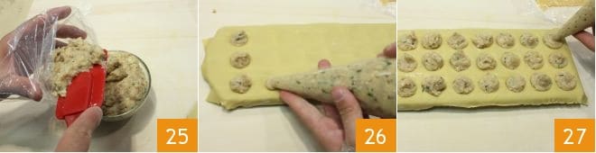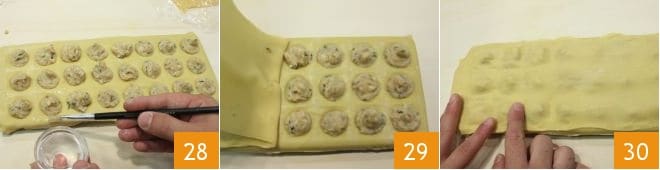 Brush the surface of the sheet around the filling 28. Then roll out the other half of the egg pasta and place it over the filling 29. Press lightly with your fingers 30 to adhere the two sheets.