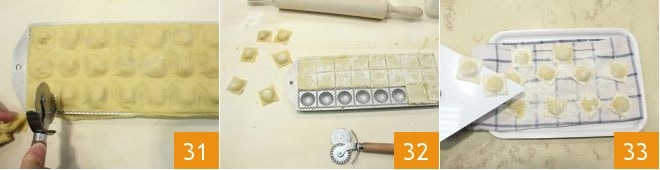 Then, using a fluted pastry cutter, trim the edges to create the ravioli (31-32). Place the ravioli on a tray lined with a lightly floured kitchen cloth 33.