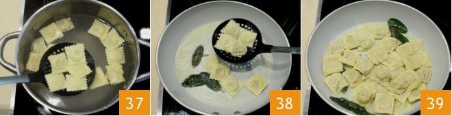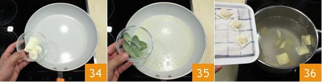 Fill a pot with water, salt to taste, and bring to a boil. While the water heats, in a large pan, melt the butter over very low heat 34. Add the sage leaves 35. Let the sage wilt for a few moments. Meanwhile, when the water boils, cook the ravioli 36: 1-2 minutes will suffice (they will be done when they begin to float to the surface).
