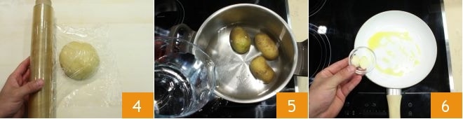 Then transfer the dough to a work surface or a cutting board and form a ball. Wrap it with plastic wrap 4 and place it in the refrigerator for at least an hour. In the meantime, prepare the filling: boil the potatoes in a large pot 5 for about 15-20 minutes or until cooked. To facilitate cooking, you can also cut the potatoes in half. While they cook, peel two garlic cloves and place them in a small pan with oil 6.