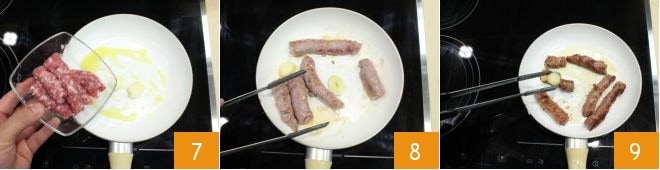 Remove the casing from the sausage by gently cutting it. Add it to the pan 7 and cook for about 15 minutes or until well browned, turning the sausages on all sides 8 to cook evenly. When well browned, turn off the heat and remove the garlic cloves 9.