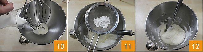 While the cake is baking, proceed to whip the cream for the decoration: pour the liquid cream into a bowl 10 and sift the powdered sugar 11. Then whip the cream to decorate the cheesecake 12. For this step, you can consult the cooking school guide: How to Whip Cream.
