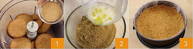 To prepare the Red Velvet cheesecake, start by preparing the crust: put the Digestive biscuits in a mixer along with the brown sugar 1, then finely chop them. Place the butter to melt in a saucepan over low heat; meanwhile, put the chopped biscuits in a bowl and gradually add the melted butter 2; then mix the ingredients well. Butter a cake pan, preferably with a removable bottom, 9 inches in diameter; cut out a circle of parchment paper the same diameter as the bottom of the pan and two strips the same height as the sides, then line the pan itself. For this operation, you can consult the cooking school guide: how to line a cake pan with parchment paper. Now, pour the crumbled biscuits into the pan lined with parchment paper and use the back of a spoon to compact the biscuit base well 3. Cool the mixture in the refrigerator for 30 minutes or in the freezer for about 10-15 minutes.