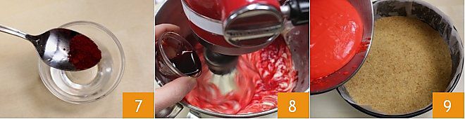 At this point, dissolve the powder colorant in 50 ml (1/4 cup) of water 7, mix with a teaspoon, and add it to the cream 8. If you use liquid or gel colorant, there is no need to dissolve it in water and you can use the amount necessary for the cream to take on the desired color. Mix well with the beaters, and finally, add the sifted potato starch to the cream and mix until you have a uniform red mixture. Then, remove the biscuit base from the refrigerator and gently lay the obtained cream 9. Be careful to cover the surface evenly with the help of a spatula. Bake the cheesecake in a preheated static oven at 340°F for about 60 minutes (if using a fan oven, 300°F for 45-50 minutes).