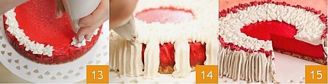 Now you can proceed to decorate the cake: once the baking time is over, remove the cheesecake from the oven and release it onto a serving plate. Let it cool; in the meantime, fill a piping bag with a star nozzle with the previously whipped cream and start garnishing your Red Velvet cheesecake with whipped cream tufts along the circumference of the cake and almost to the center, also decorating the edges (13-14). You can finish the decoration as you like, for example, with colored sugar sprinkles to give a bright red contrast to your Red Velvet cheesecake 15!