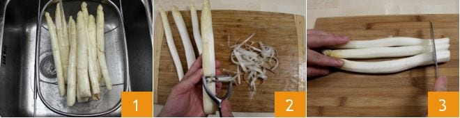 To prepare reginette with white asparagus pesto, start by thoroughly washing the asparagus under running water 1. Then peel the stalk with a vegetable peeler to remove the outermost and fibrous part 2; then cut off the ends of the stalks, the hardest part, to even them out 3. For these steps, you can also refer to the cooking school guide: how to clean asparagus.