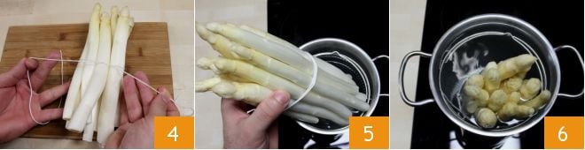 Now, tie the asparagus with kitchen twine 4. In an asparagus cooker or a tall, narrow pot, pour water until it's 3/4 full, salt it, and add the asparagus 5 to blanch them. Place them upright, leaving the tips just above the water (they will cook with the steam) 6. Cook for about 20 minutes.