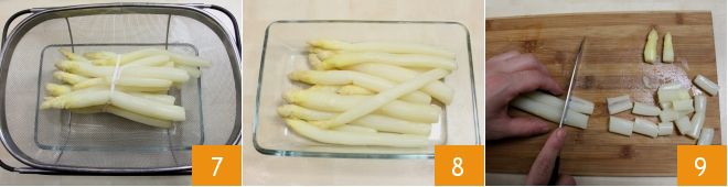 Once the time is up, drain them 7 and let them cool in a bowl 8. Then transfer the asparagus to a cutting board and cut them into chunks, keeping the tips aside 9.