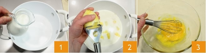 To prepare the rhubarb tart with lemon custard, start by making the Lemon Cream. Pour the milk and cream into a saucepan 1 and flavor with lemon zest, being careful not to use the bitter white part 2. In a separate bowl, beat the egg yolks and sugar with the whisks 3.