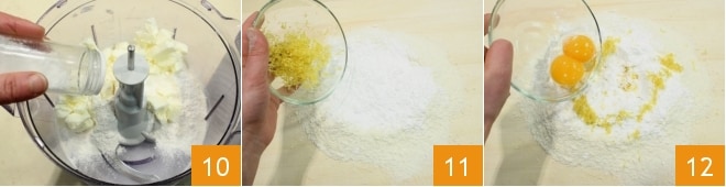 In the meantime, prepare the Shortcrust pastry starting with the sablage: place the cold butter cut into cubes in a food processor equipped with blades along with the flour 10. Operate the processor until a sandy mixture is obtained, then transfer it to a work surface; make a well and add the powdered sugar, grated lemon zest 11, and egg yolks 12.