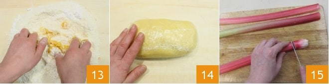 First, work the dough with a fork, then with your hands 13; knead briefly, just long enough to compact the dough so the pastry doesn't become too warm from the heat of your hands and stays crisp. Form a patty and flatten it before wrapping it in plastic wrap 14; place it in the refrigerator to firm up for at least 30 minutes. In the meantime, clean the rhubarb by washing, drying, and trimming the ends 15.