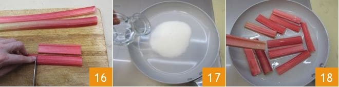 Cut the rhubarb into 4-inch strips 16. In a pan, pour the sugar and water and turn on the heat 17. Dissolve the sugar and place the rhubarb pieces, cooking them for about 2 minutes on each side 18.
