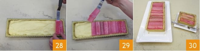 Once finished, decorate the tart with the rhubarb cut into strips, carefully placing them on the custard side by side (28-29); bake in a static oven at 355°F for 30 minutes (or at 320°F for 20 minutes if using a convection oven). Once ready, let it cool, and finally, you can enjoy your rhubarb tart with lemon custard 30!