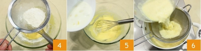 Add the sifted cornstarch 4, then the hot milk a little at a time 5 and mix vigorously to get a smooth and fluid mixture. Pour the mixture back into the saucepan, filtering it with a sieve 6.