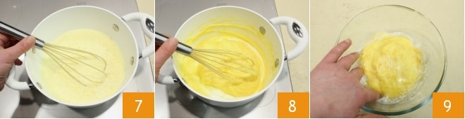 Put the mixture back on the heat 7, stirring until it thickens 8, then transfer it to a bowl and cover it with plastic wrap in contact with the surface to prevent a skin from forming 9. Let the cream cool first at room temperature and then in the refrigerator.