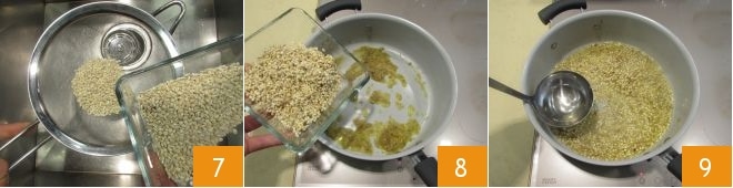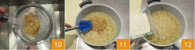 At this point, take the spelt and rinse it in plenty of water, using a sieve 10. Then, add it to the barley while it is cooking in the saucepan 11 and also add the rice 12.