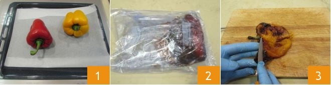 To prepare the rice, barley, and spelt in pepper and tofu sauce, first, start with the preparation of the peppers. Take the peppers, wash them, and dry them. Then place them on a baking tray lined with parchment paper and place them in a preheated static oven at 482°F (250°C) for about 25 minutes 1. Occasionally turn the peppers while they cook in the oven to allow for even cooking. When they are cooked, that is when the skin begins to come off, remove the peppers from the oven and place them in a plastic food bag to sweat 2. When they have reached room temperature, open the bag and peel them 3.