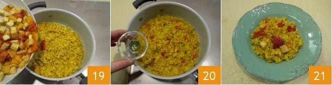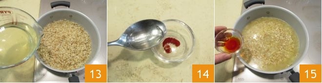 Cook the three grains by adding the broth little by little 13. Dissolve the saffron sachet in a small bowl with some broth 14. When it is completely dissolved and free of lumps, add it to the grains that are cooking 15. Salt and pepper. Continue cooking by adding broth gradually.