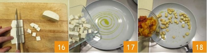 While the grains are cooking, take the tofu and cut it first into horizontal strips and then into small cubes 16. Once you have cut the tofu, take a non-stick pan and pour in two tablespoons of oil. Then add the cubed tofu 17 and adjust with salt and pepper. Now add the diced peppers 18.