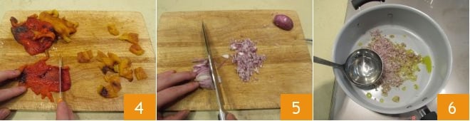 Cut the peppers in half and remove the external stem, internal seeds, and white filaments. Take the halved pepper and cut it into strips and then into small squares 4. Meanwhile, clean and finely chop the shallot 5. Take a saucepan and sprinkle it with 2 tablespoons of oil. At this point, fry the shallot in the saucepan and let it wilt. Add some water to help the shallot wilt better 6.
