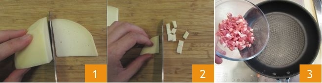 To prepare the rice disc, first cut the caciocavallo into slices 1 and then dice it 2. In a hot pan, add the bacon 3 and sauté for 3 minutes over high heat without adding any extra fats.
