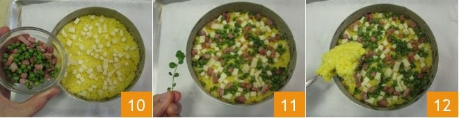 and the peas sautéed with bacon 10. Season with fresh oregano 11 and cover again with the leftover risotto 12.