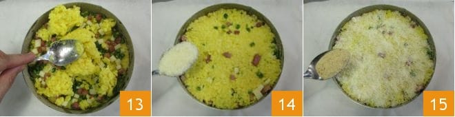 Press the surface well with the back of a spoon 13 and cover with Parmesan 14 and breadcrumbs 15.