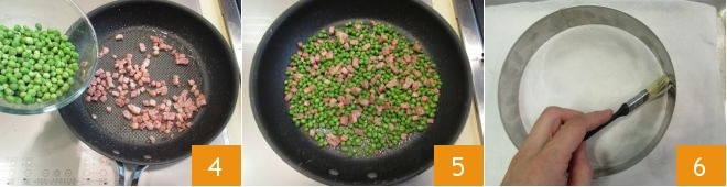 Then add the peas 4 and sauté for another 3 minutes, then turn off the heat and set aside 5. Brush with butter the inner edge of a pastry ring with a diameter of 20 cm (8 inches) 6