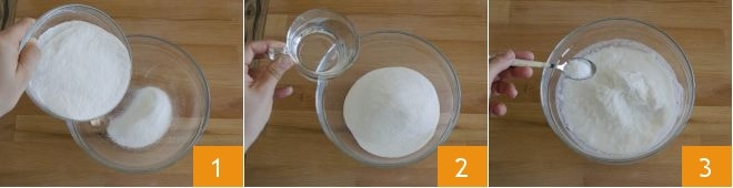 To prepare rice gnocchi with mussels and cherry tomatoes, start by making the rice gnocchi. In a bowl, add the rice flour 1 and gradually add the water 2. Add the salt 3 and mix roughly.