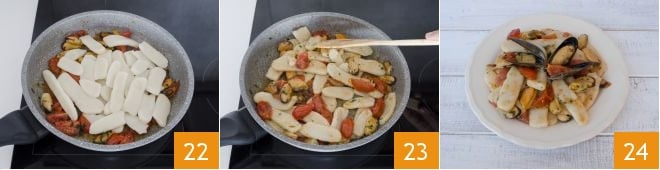 Drain and add the gnocchi to the seasoning in the pan 22. Sauté for a few minutes to mix all the ingredients 23 and then serve the rice gnocchi with mussels and cherry tomatoes hot 24.