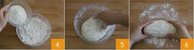 Add the all-purpose flour 4. Knead until you get a soft and non-sticky dough 5. If needed, add more all-purpose flour until fully absorbed. Dust the pastry board with flour, place the dough on it 6;