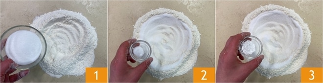 To prepare the rice pastiera, start by placing the ricotta in a strainer to drain the excess whey. In the meantime, prepare the pastry: on a work surface, pour the flour in a mound, add the sugar 1, salt 2, and baking powder 3.