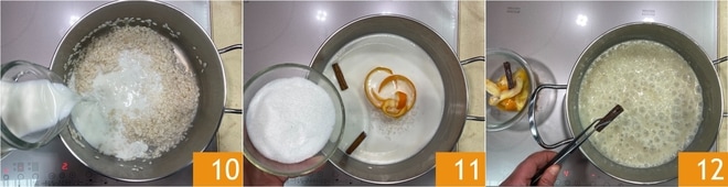 Add the milk 10, cinnamon sticks, orange zest, and sugar 11. Cook over low heat for 30 minutes, stirring often. Then remove the aromas 12.