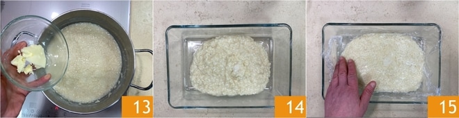 Add the butter 13, stir and continue cooking for another 5 minutes, then pour the cooked rice into a baking dish 14, let it cool, cover with plastic wrap and set aside 15.