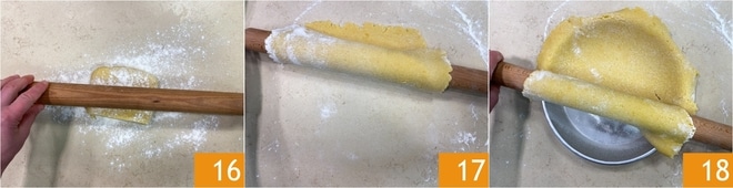 Take the pastry and roll it out on the work surface with a rolling pin 16 to a thickness of half a centimeter, wrap the sheet around the rolling pin 17 and unroll it on a flared pan measuring 22 cm at the base, 26 cm at the top, and 4 cm in height 18, previously buttered and floured.