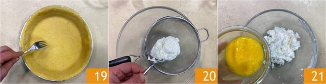 Prick the bottom with a fork 19. Sift the ricotta through a strainer to make it smoother 20. Beat the eggs in a bowl and pour them over the ricotta 21.