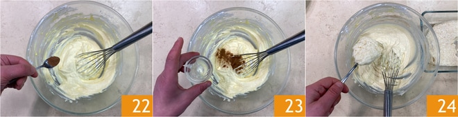 Mix with a whisk, flavor with cinnamon powder 22 and orange blossom 23. Add the cooked and cooled rice 24.