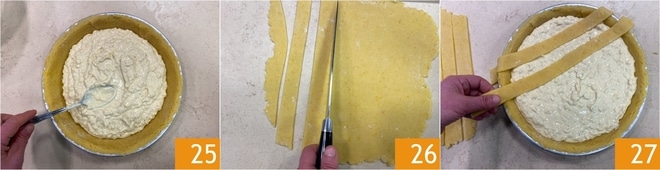 Pour the filling into the mold, leveling the surface with the back of a spoon 25. Roll out the remaining pastry again to a thickness of half a centimeter. Cut strips 2 cm wide, long enough to cover the dessert. Place a row of strips on the pastiera 27.