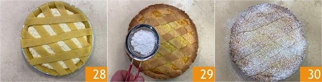 Then weave them in the other direction to create diamonds 28. Bake in a preheated static oven at 350°F for 60 minutes, on the lowest shelf of the oven. Once cooked, let the dessert cool and then garnish with powdered sugar 29. The rice pastiera is ready to be served 30.