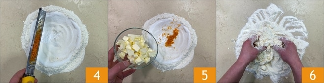 Perfume with grated orange zest 4 and add the cold butter cut into pieces 5. Knead quickly 6.