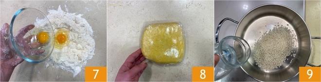 Add the eggs 7 and continue kneading quickly to incorporate them and obtain a homogeneous dough, wrap it in plastic wrap and place it in the refrigerator for 30 minutes 8. In a pot, pour the rice and water 9. Cook over high heat for 8 minutes from when it starts boiling, stirring often.