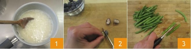 To prepare the rice salad with dried fruit, start by cooking the rice: bring a pot of water to a boil, add salt, pour in the rice, and let it cook for the time indicated on the package 1. Meanwhile, you can prepare the other ingredients that will make up the salad: wash the blueberries and cut them in half 2, then wash the green beans, trim them, and also divide them lengthwise in half 3.