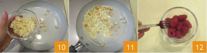 Now coarsely chop the hazelnuts, place them in a hot pan along with the slivered almonds 10, and toast them over high heat for about a minute 11. Lastly, prepare the raspberry dressing: gently wash and pat dry the raspberries, transfer them to a small bowl, and mash them with a fork 12,
