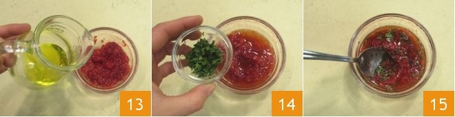 then season the puree with 2 tbsps of oil 13, a pinch of salt, and the chopped mint leaves 14, mix well 15, and set aside.