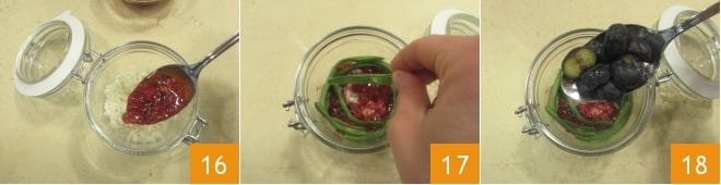 Now you can assemble your rice salad inside the jars: add a spoonful of rice to the bottom of the jar, pour a tablespoon of raspberry dressing 16, lay down a layer of green beans 17, add a tablespoon of blueberries 18,