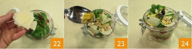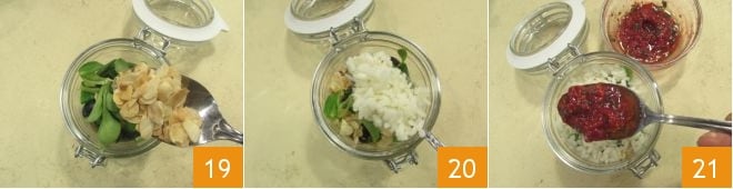 some lamb's lettuce leaves, and finally, a tablespoon of toasted dried fruit 19. Repeat the layers by adding another spoonful of rice 20, a tablespoon of raspberry dressing 21,