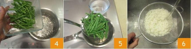 Fill another small pot with water and bring it to a boil, add the sliced green beans 4, and blanch them for about a minute, then drain and transfer them to a bowl filled with cold water (preferably with added ice cubes) 5: this way, you'll stop the green beans from cooking further, keeping them crunchy and allowing them to retain their color. Once cooled, drain the green beans, dry them, and set them aside. After the rice has finished cooking, drain it and rinse it under cold running water to stop the cooking 6.