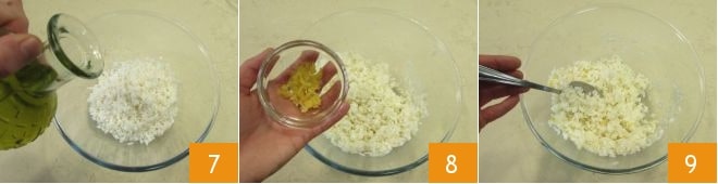 Transfer the well-drained rice into a bowl, season it with a teaspoon of oil 7 and the grated zest of half a lemon 8, mix well 9, and set aside.