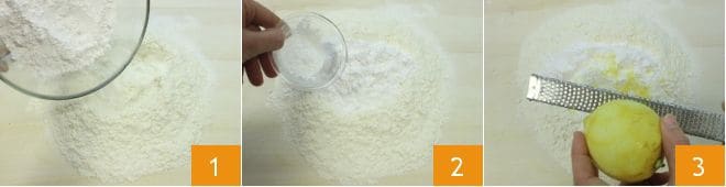 To prepare the rice tart, start with the pastry: make a well with the sifted flour on a work surface 1, then add the powdered sugar 2. Next, add the vanilla seeds and the baking powder. Continue by grating the zest of an untreated lemon 3,