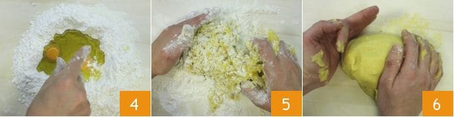 then also add the eggs and olive oil 4. Then start mixing with a fork 5 starting from the center in a circular manner and gradually expanding more and more to incorporate the flour. When the liquids are absorbed, start kneading quickly by hand until a smooth and homogeneous dough is formed; shape it into a ball 6.